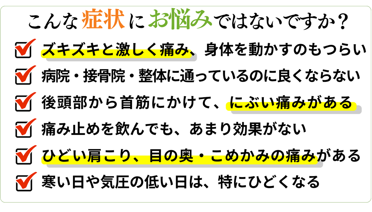 ・片側の首から後頭部・頭頂部にかけて、チクチク、キリキリ、ズキズキとした激痛がある。